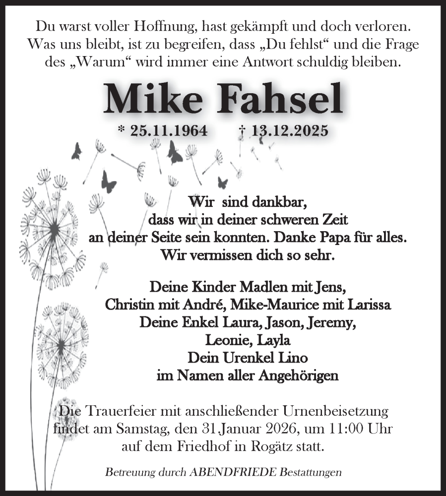 Hier finden Sie alle Traueranzeigen aus der Zeitung, die bisher für Mike Fahsel erschienen sind. Weitere Traueranzeigen, die in der Zeitung erscheinen, werden hier ebenfalls aufgelistet