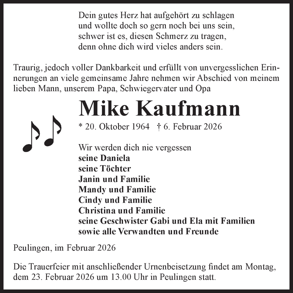 Hier finden Sie alle Traueranzeigen aus der Zeitung, die bisher für Mike Kaufmann erschienen sind. Weitere Traueranzeigen, die in der Zeitung erscheinen, werden hier ebenfalls aufgelistet