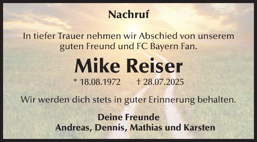 Hier finden Sie alle Traueranzeigen aus der Zeitung, die bisher für Mike Reiser erschienen sind. Weitere Traueranzeigen, die in der Zeitung erscheinen, werden hier ebenfalls aufgelistet