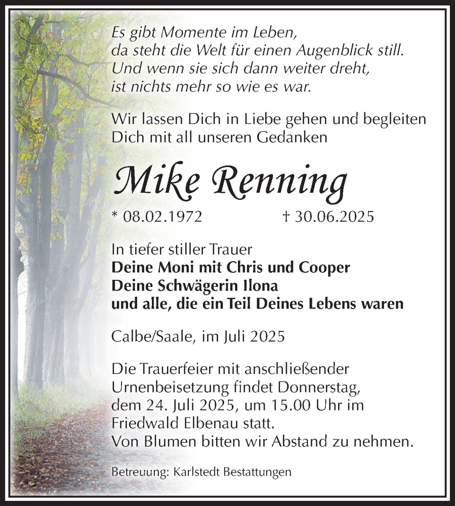 Hier finden Sie alle Traueranzeigen aus der Zeitung, die bisher für Mike Renning erschienen sind. Weitere Traueranzeigen, die in der Zeitung erscheinen, werden hier ebenfalls aufgelistet