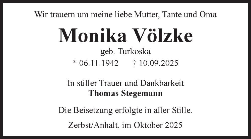 Hier finden Sie alle Traueranzeigen aus der Zeitung, die bisher für Monika Völzke erschienen sind. Weitere Traueranzeigen, die in der Zeitung erscheinen, werden hier ebenfalls aufgelistet