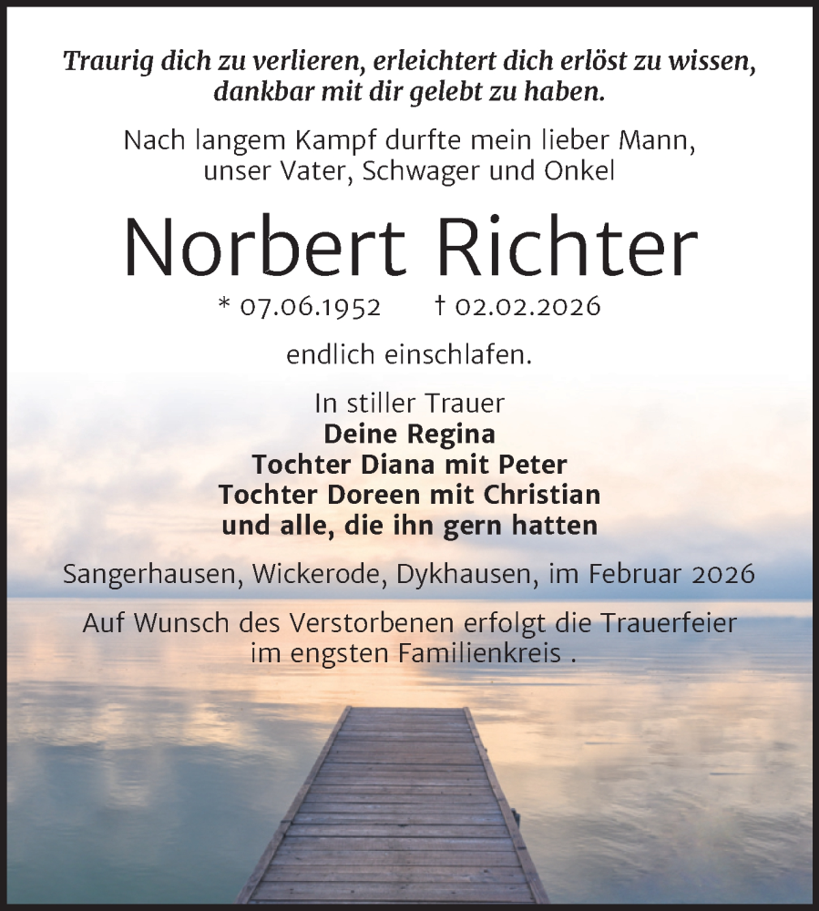 Hier finden Sie alle Traueranzeigen aus der Zeitung, die bisher für Norbert Richter erschienen sind. Weitere Traueranzeigen, die in der Zeitung erscheinen, werden hier ebenfalls aufgelistet