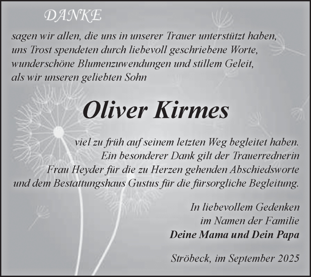 Hier finden Sie alle Traueranzeigen aus der Zeitung, die bisher für Oliver Kirmes erschienen sind. Weitere Traueranzeigen, die in der Zeitung erscheinen, werden hier ebenfalls aufgelistet