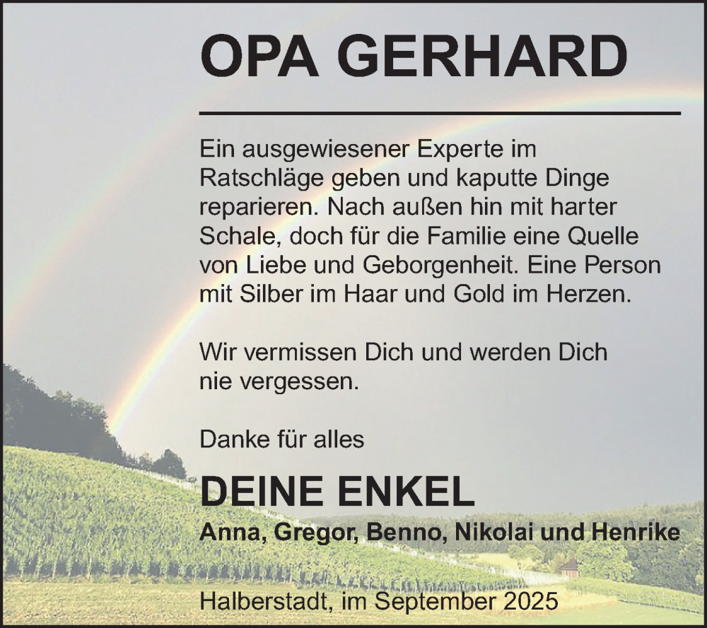 Hier finden Sie alle Traueranzeigen aus der Zeitung, die bisher für Opa Gerhard erschienen sind. Weitere Traueranzeigen, die in der Zeitung erscheinen, werden hier ebenfalls aufgelistet