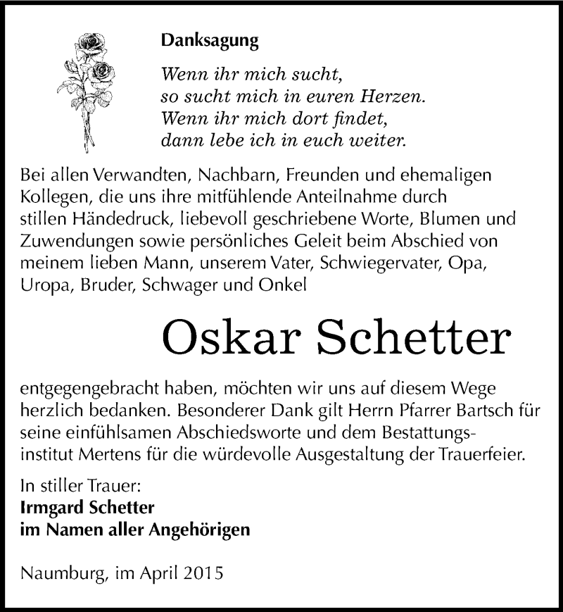 Hier finden Sie alle Traueranzeigen aus der Zeitung, die bisher für Oskar Schetter erschienen sind. Weitere Traueranzeigen, die in der Zeitung erscheinen, werden hier ebenfalls aufgelistet