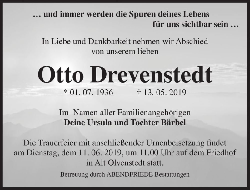 Hier finden Sie alle Traueranzeigen aus der Zeitung, die bisher für Otto Drevenstedt erschienen sind. Weitere Traueranzeigen, die in der Zeitung erscheinen, werden hier ebenfalls aufgelistet