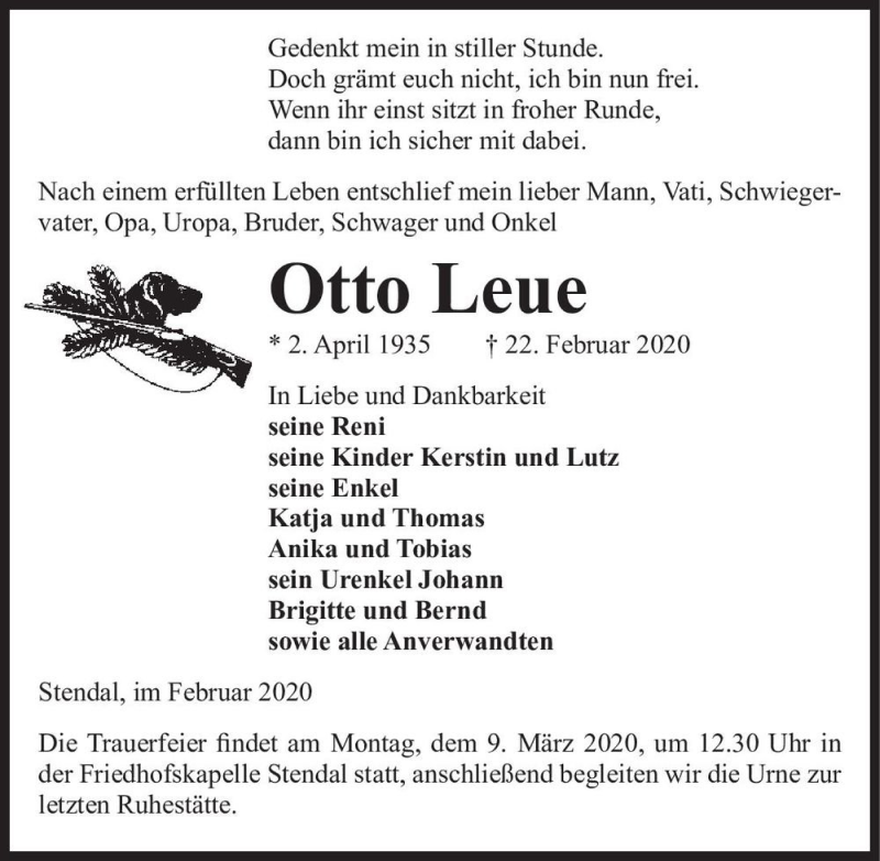 Hier finden Sie alle Traueranzeigen aus der Zeitung, die bisher für Otto Leue erschienen sind. Weitere Traueranzeigen, die in der Zeitung erscheinen, werden hier ebenfalls aufgelistet