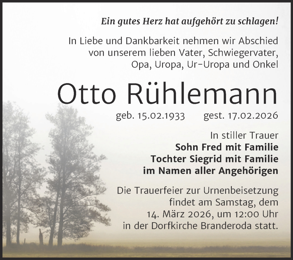 Hier finden Sie alle Traueranzeigen aus der Zeitung, die bisher für Otto Rühlemann erschienen sind. Weitere Traueranzeigen, die in der Zeitung erscheinen, werden hier ebenfalls aufgelistet