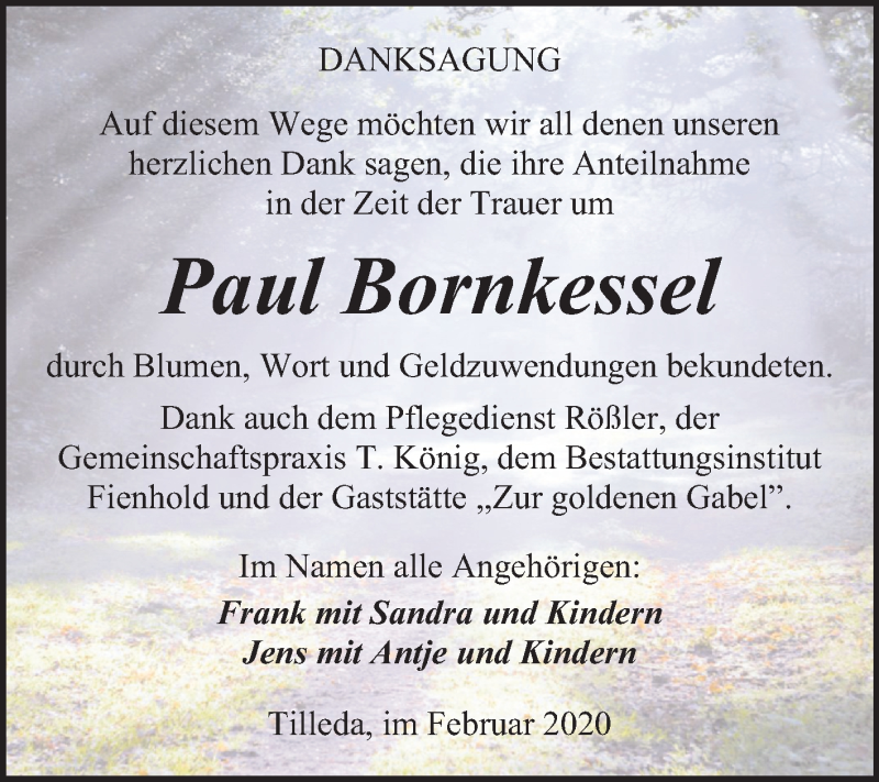 Hier finden Sie alle Traueranzeigen aus der Zeitung, die bisher für Paul Bornkessel erschienen sind. Weitere Traueranzeigen, die in der Zeitung erscheinen, werden hier ebenfalls aufgelistet