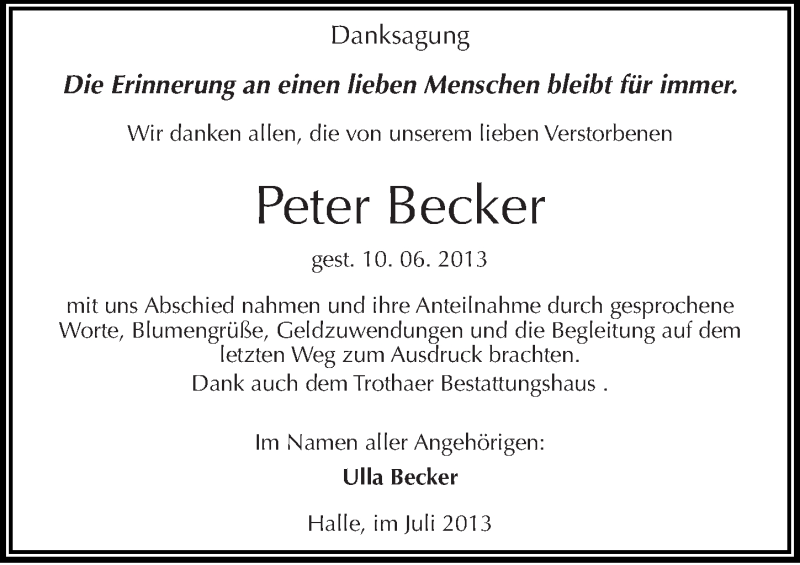 Hier finden Sie alle Traueranzeigen aus der Zeitung, die bisher für Peter Becker erschienen sind. Weitere Traueranzeigen, die in der Zeitung erscheinen, werden hier ebenfalls aufgelistet