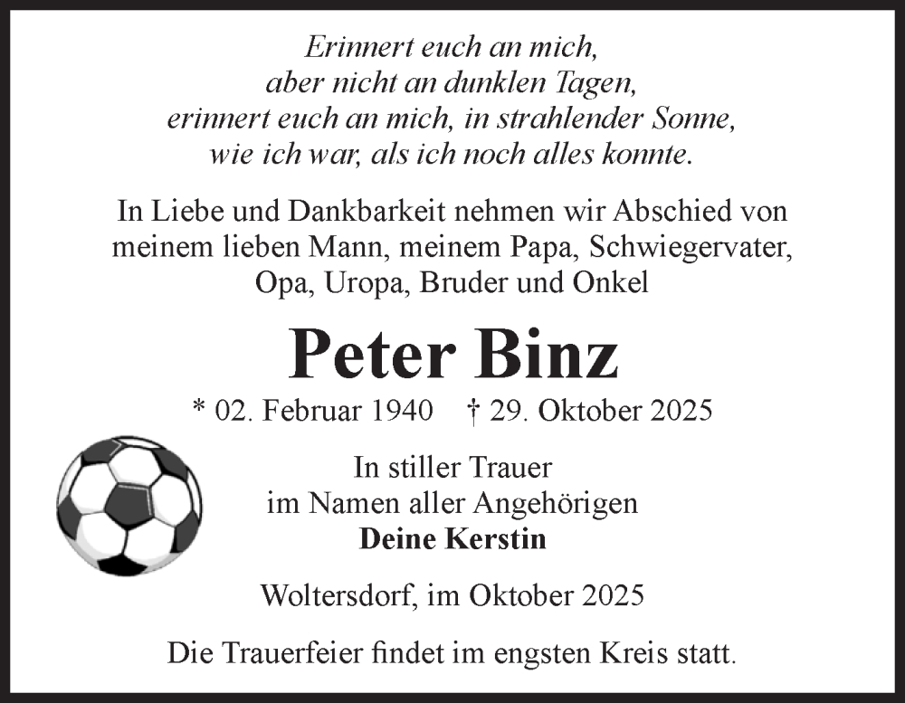 Hier finden Sie alle Traueranzeigen aus der Zeitung, die bisher für Peter Binz erschienen sind. Weitere Traueranzeigen, die in der Zeitung erscheinen, werden hier ebenfalls aufgelistet