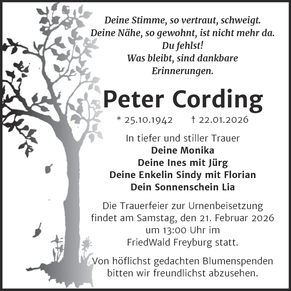 Hier finden Sie alle Traueranzeigen aus der Zeitung, die bisher für Peter Cording erschienen sind. Weitere Traueranzeigen, die in der Zeitung erscheinen, werden hier ebenfalls aufgelistet