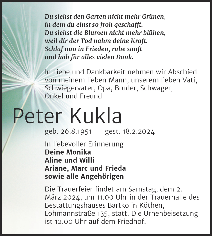 Hier finden Sie alle Traueranzeigen aus der Zeitung, die bisher für Peter Kukla erschienen sind. Weitere Traueranzeigen, die in der Zeitung erscheinen, werden hier ebenfalls aufgelistet