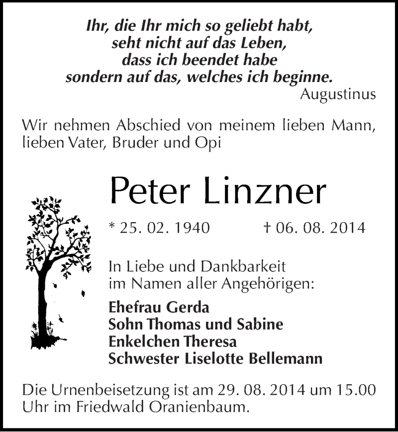 Hier finden Sie alle Traueranzeigen aus der Zeitung, die bisher für Peter Linzner erschienen sind. Weitere Traueranzeigen, die in der Zeitung erscheinen, werden hier ebenfalls aufgelistet