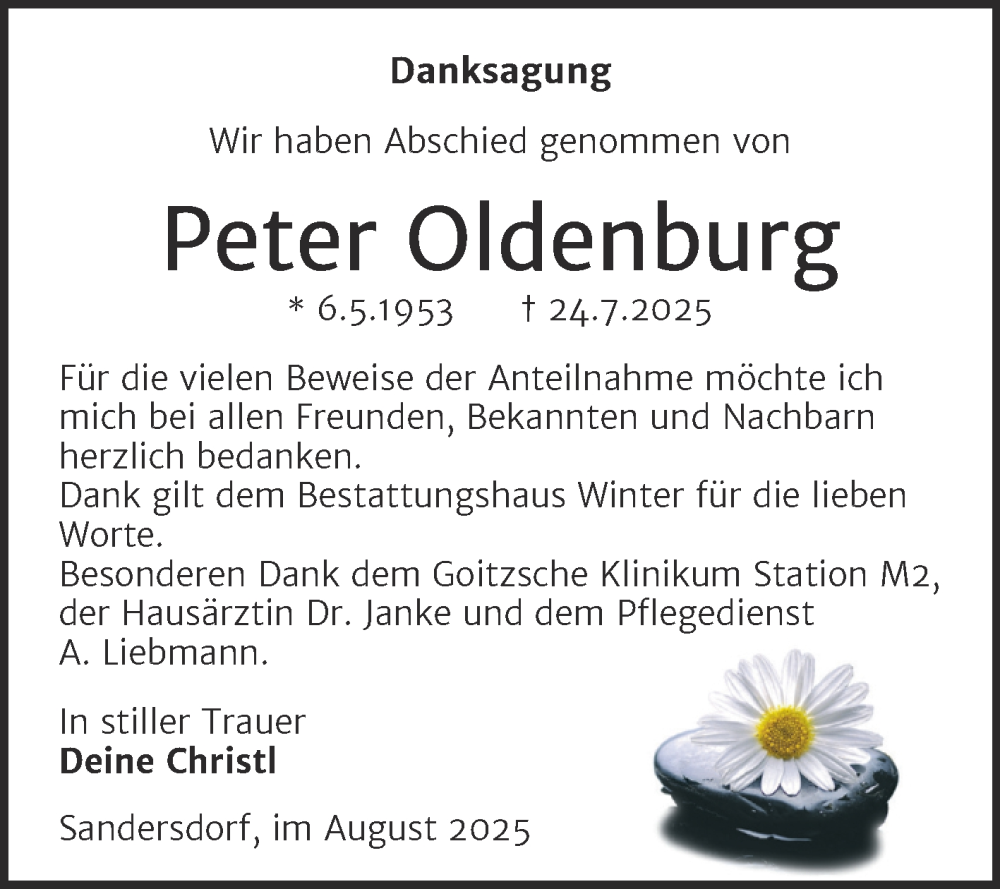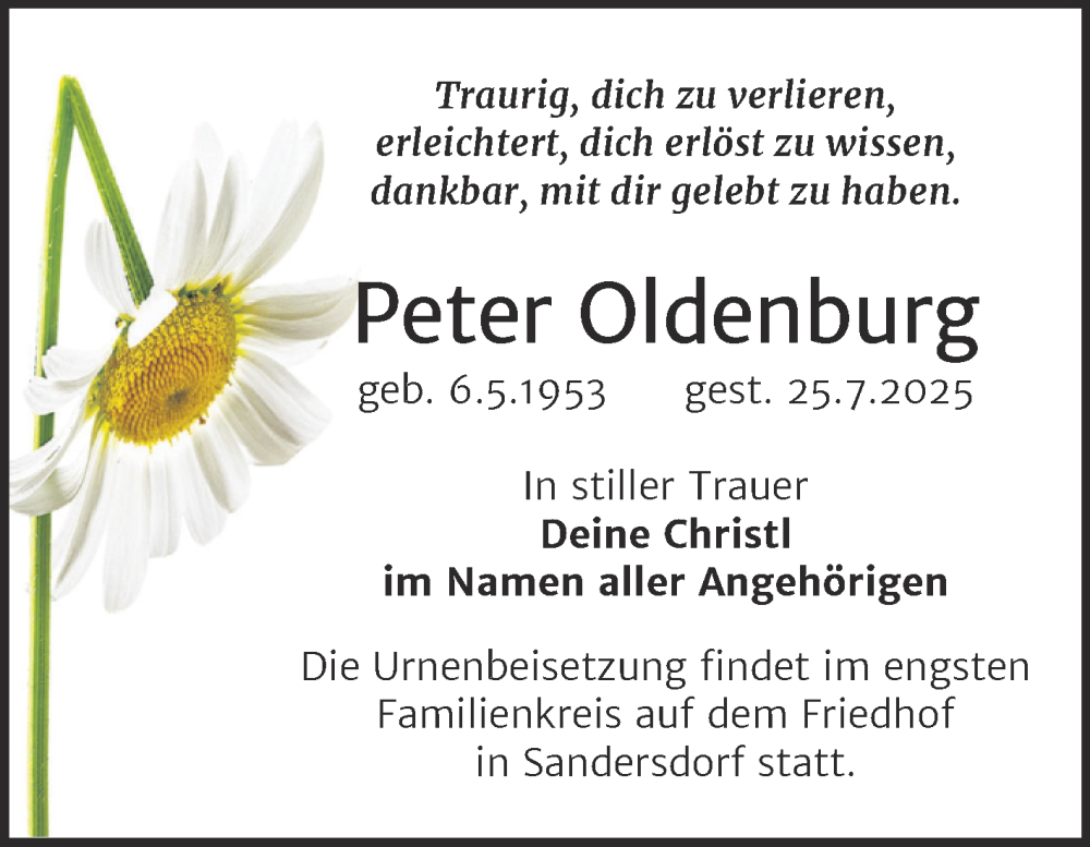 Hier finden Sie alle Traueranzeigen aus der Zeitung, die bisher für Peter Oldenburg erschienen sind. Weitere Traueranzeigen, die in der Zeitung erscheinen, werden hier ebenfalls aufgelistet