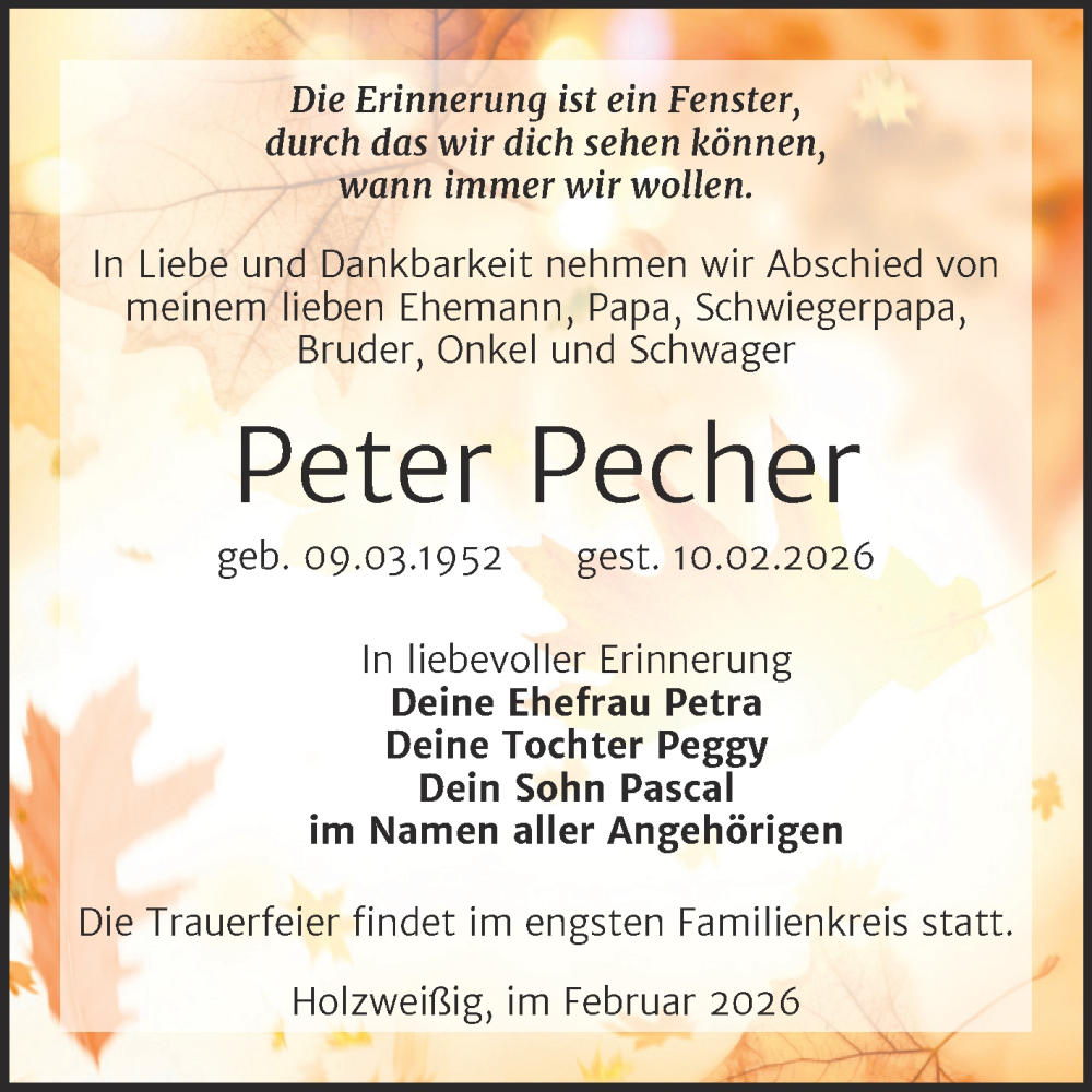 Hier finden Sie alle Traueranzeigen aus der Zeitung, die bisher für Peter Pecher erschienen sind. Weitere Traueranzeigen, die in der Zeitung erscheinen, werden hier ebenfalls aufgelistet