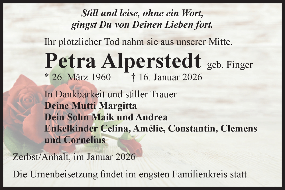 Hier finden Sie alle Traueranzeigen aus der Zeitung, die bisher für Petra Alperstedt erschienen sind. Weitere Traueranzeigen, die in der Zeitung erscheinen, werden hier ebenfalls aufgelistet