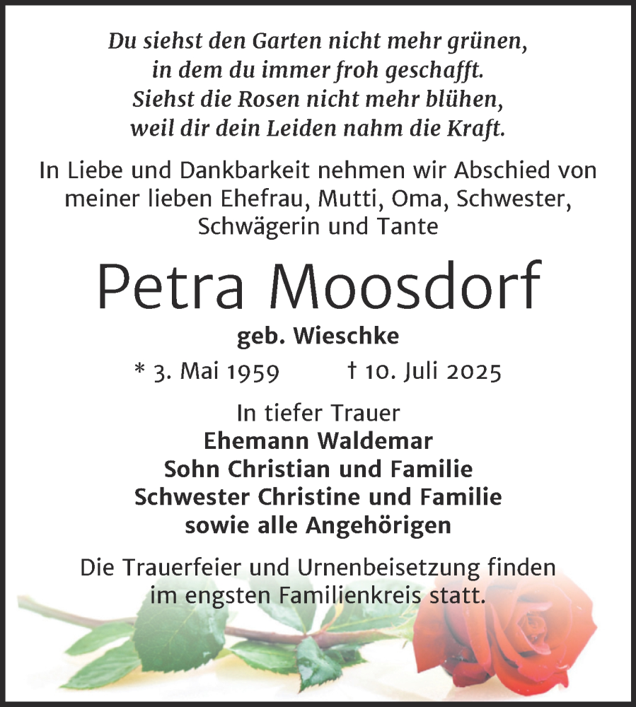 Hier finden Sie alle Traueranzeigen aus der Zeitung, die bisher für Petra Moosdorf erschienen sind. Weitere Traueranzeigen, die in der Zeitung erscheinen, werden hier ebenfalls aufgelistet