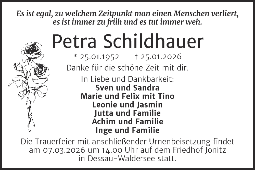Hier finden Sie alle Traueranzeigen aus der Zeitung, die bisher für Petra Schildhauer erschienen sind. Weitere Traueranzeigen, die in der Zeitung erscheinen, werden hier ebenfalls aufgelistet