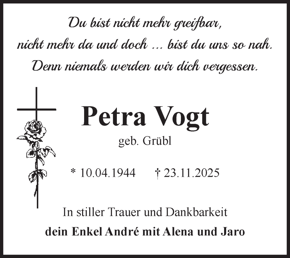 Hier finden Sie alle Traueranzeigen aus der Zeitung, die bisher für Petra Vogt erschienen sind. Weitere Traueranzeigen, die in der Zeitung erscheinen, werden hier ebenfalls aufgelistet