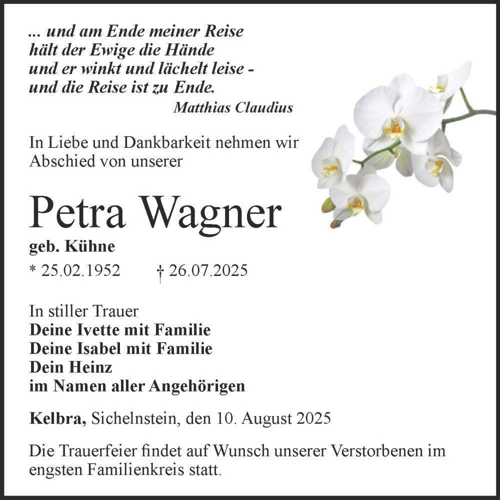 Hier finden Sie alle Traueranzeigen aus der Zeitung, die bisher für Petra Wagner erschienen sind. Weitere Traueranzeigen, die in der Zeitung erscheinen, werden hier ebenfalls aufgelistet
