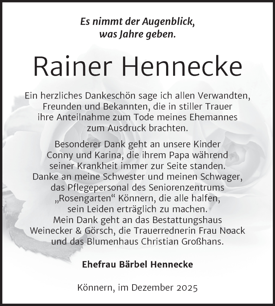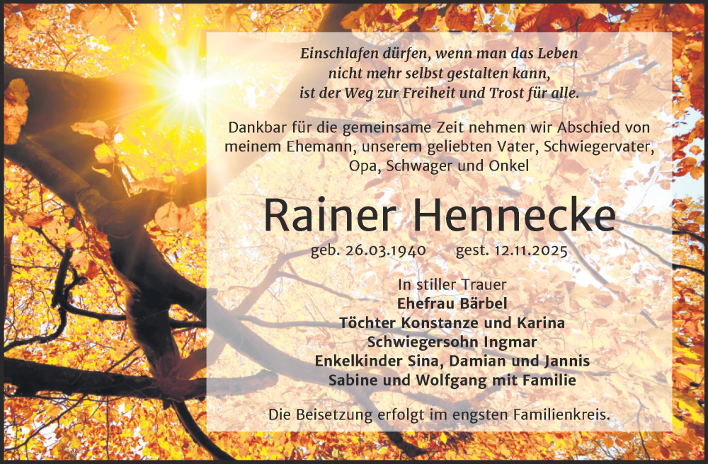Hier finden Sie alle Traueranzeigen aus der Zeitung, die bisher für Rainer Hennecke erschienen sind. Weitere Traueranzeigen, die in der Zeitung erscheinen, werden hier ebenfalls aufgelistet