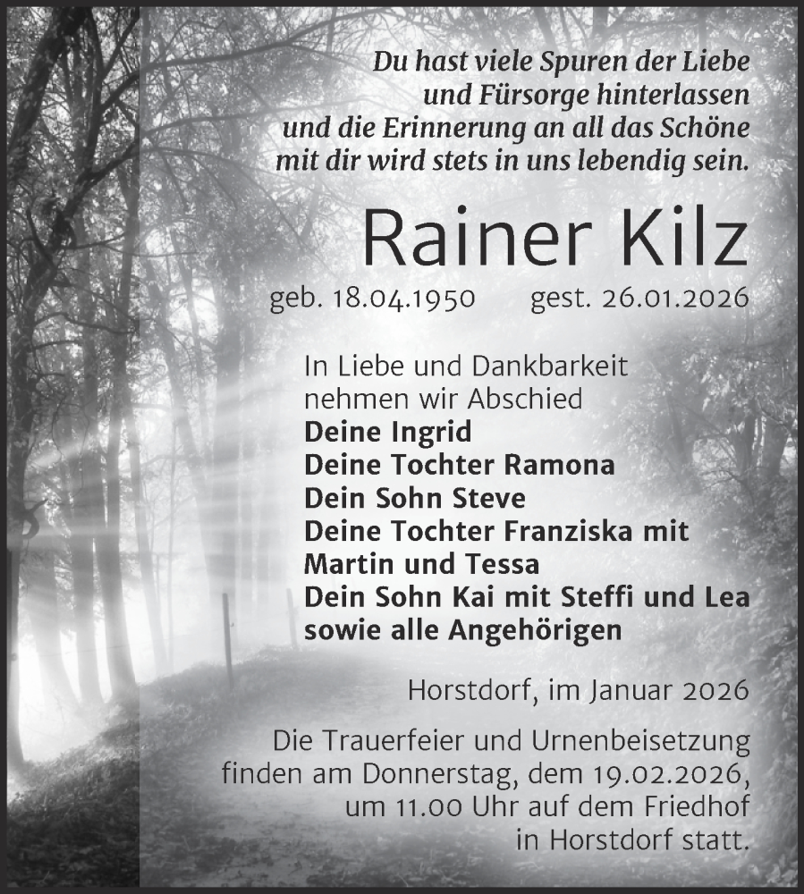 Hier finden Sie alle Traueranzeigen aus der Zeitung, die bisher für Rainer Kilz erschienen sind. Weitere Traueranzeigen, die in der Zeitung erscheinen, werden hier ebenfalls aufgelistet