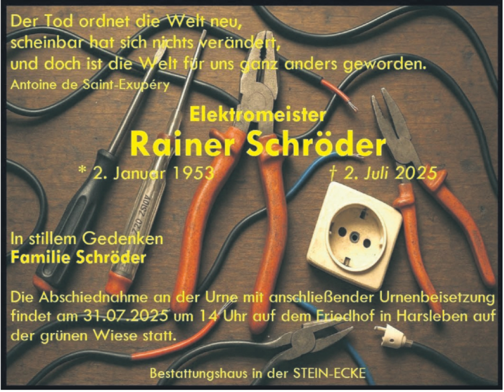 Hier finden Sie alle Traueranzeigen aus der Zeitung, die bisher für Rainer Schröder erschienen sind. Weitere Traueranzeigen, die in der Zeitung erscheinen, werden hier ebenfalls aufgelistet