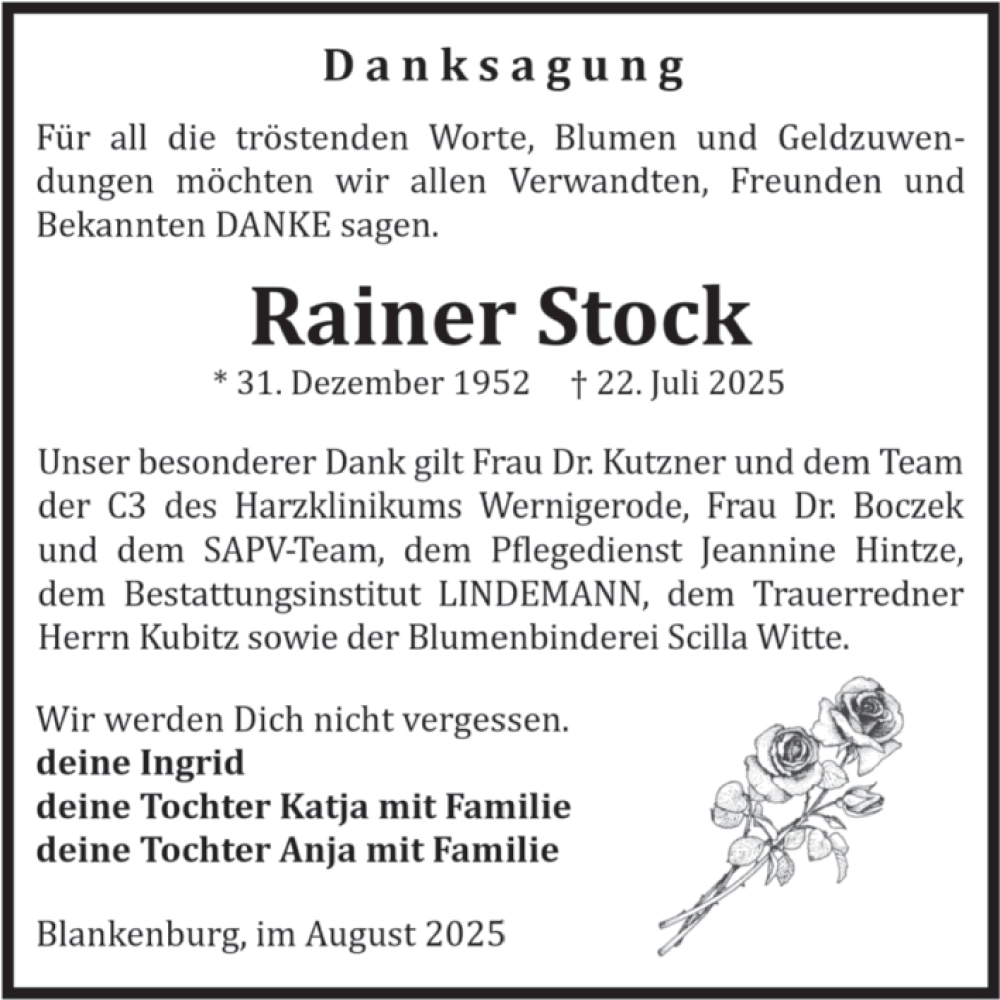 Hier finden Sie alle Traueranzeigen aus der Zeitung, die bisher für Rainer Stock erschienen sind. Weitere Traueranzeigen, die in der Zeitung erscheinen, werden hier ebenfalls aufgelistet