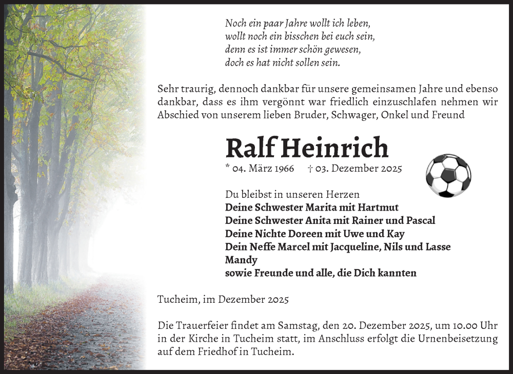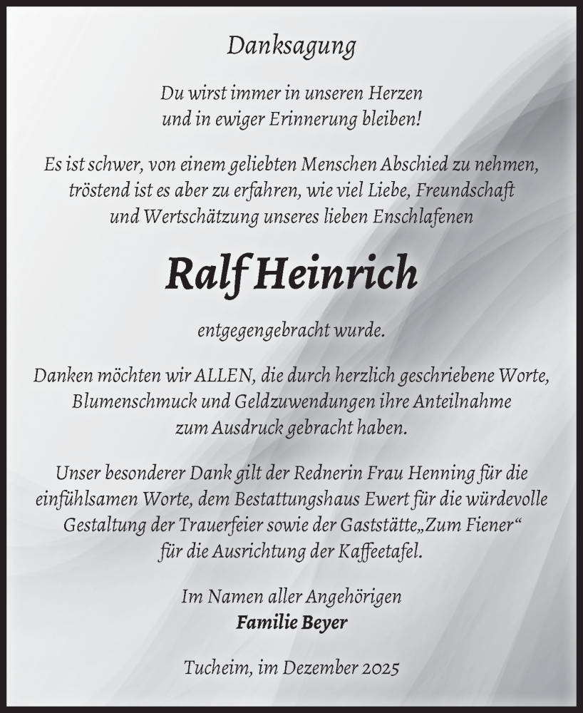 Hier finden Sie alle Traueranzeigen aus der Zeitung, die bisher für Ralf Heinrich erschienen sind. Weitere Traueranzeigen, die in der Zeitung erscheinen, werden hier ebenfalls aufgelistet