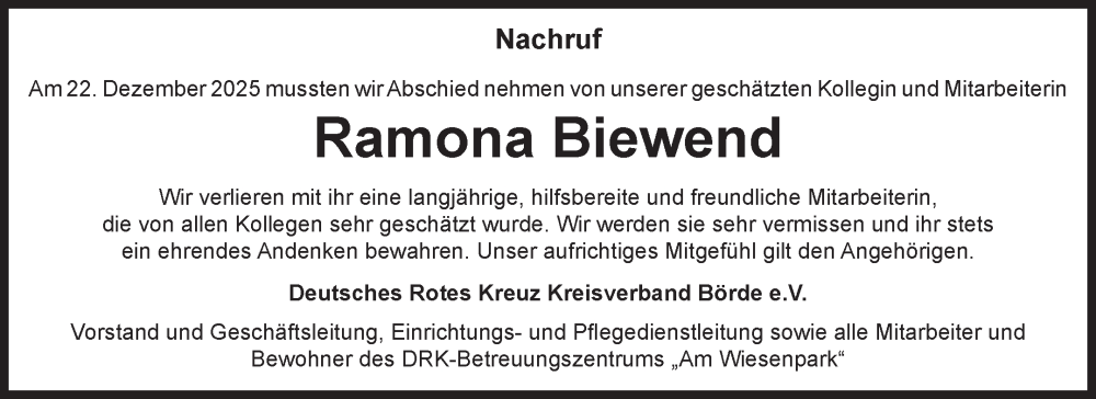 Hier finden Sie alle Traueranzeigen aus der Zeitung, die bisher für Ramona Biewend erschienen sind. Weitere Traueranzeigen, die in der Zeitung erscheinen, werden hier ebenfalls aufgelistet