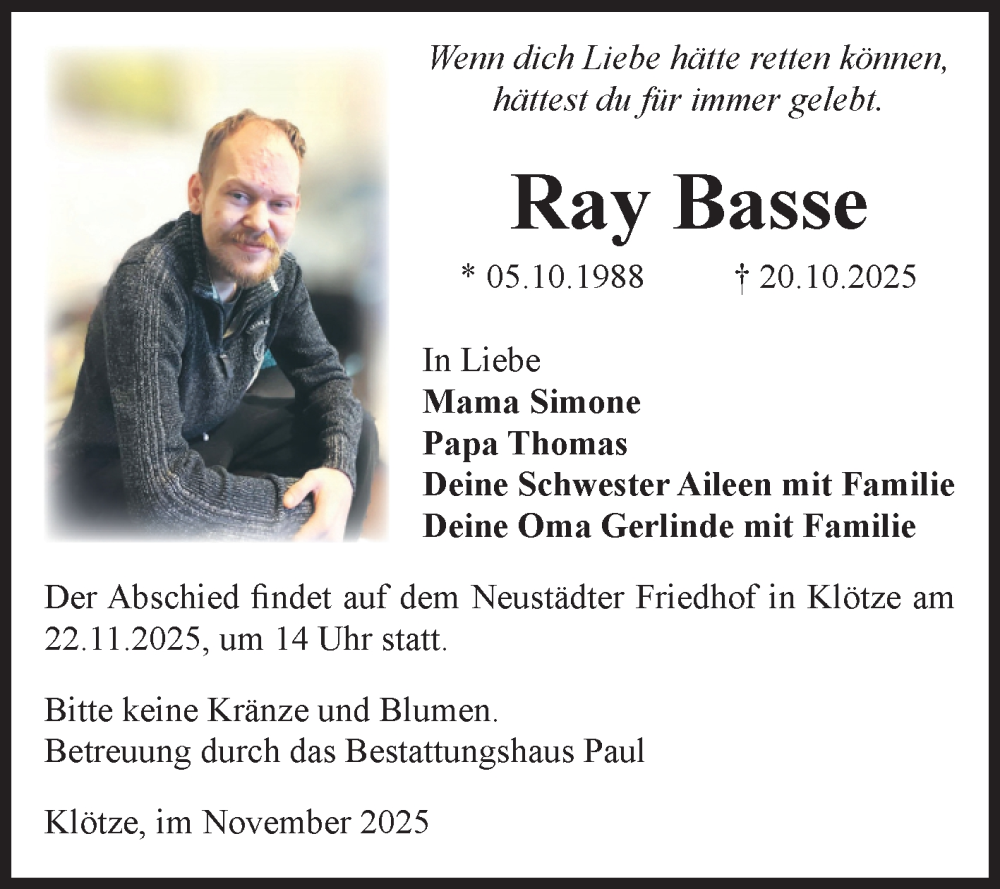 Hier finden Sie alle Traueranzeigen aus der Zeitung, die bisher für Ray Basse erschienen sind. Weitere Traueranzeigen, die in der Zeitung erscheinen, werden hier ebenfalls aufgelistet