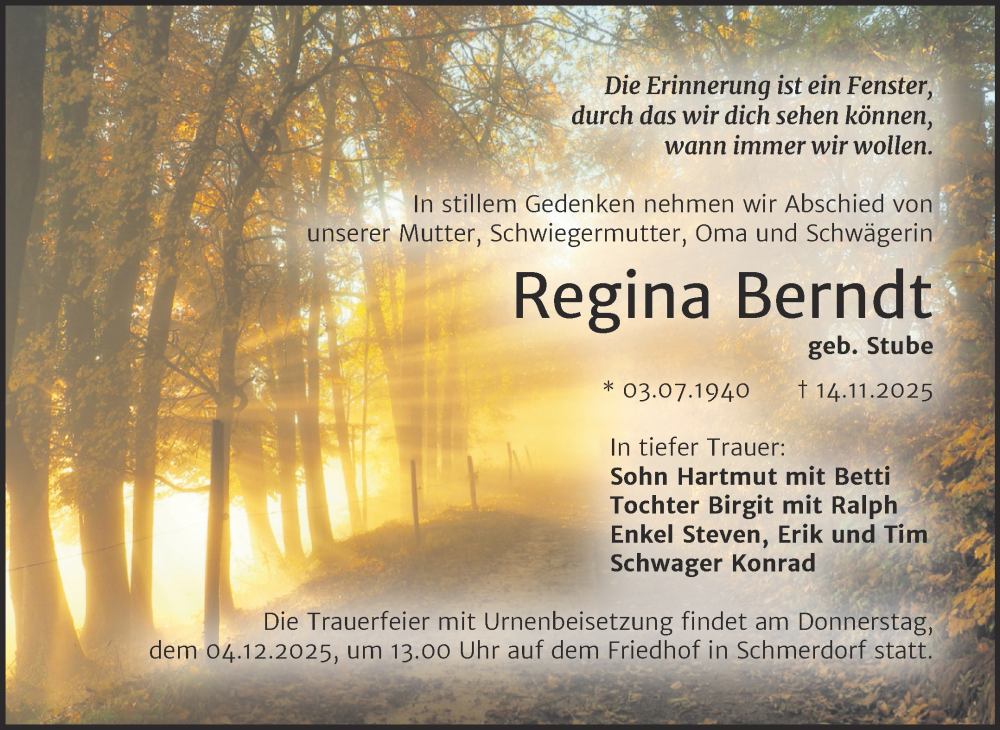 Hier finden Sie alle Traueranzeigen aus der Zeitung, die bisher für Regina Berndt erschienen sind. Weitere Traueranzeigen, die in der Zeitung erscheinen, werden hier ebenfalls aufgelistet