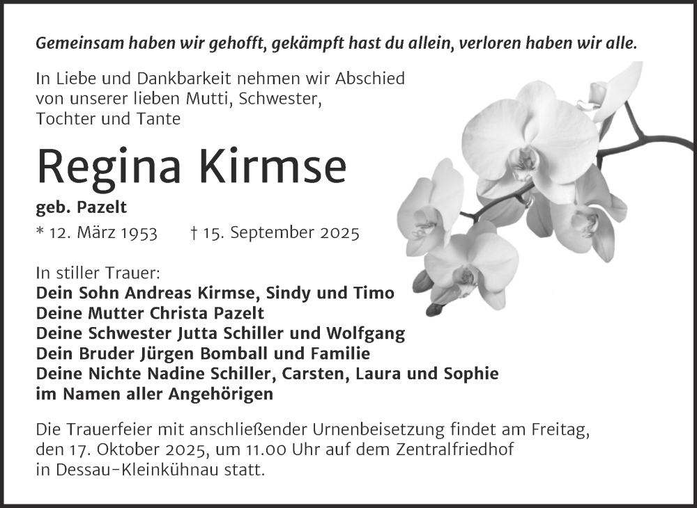 Hier finden Sie alle Traueranzeigen aus der Zeitung, die bisher für Regina Kirmse erschienen sind. Weitere Traueranzeigen, die in der Zeitung erscheinen, werden hier ebenfalls aufgelistet