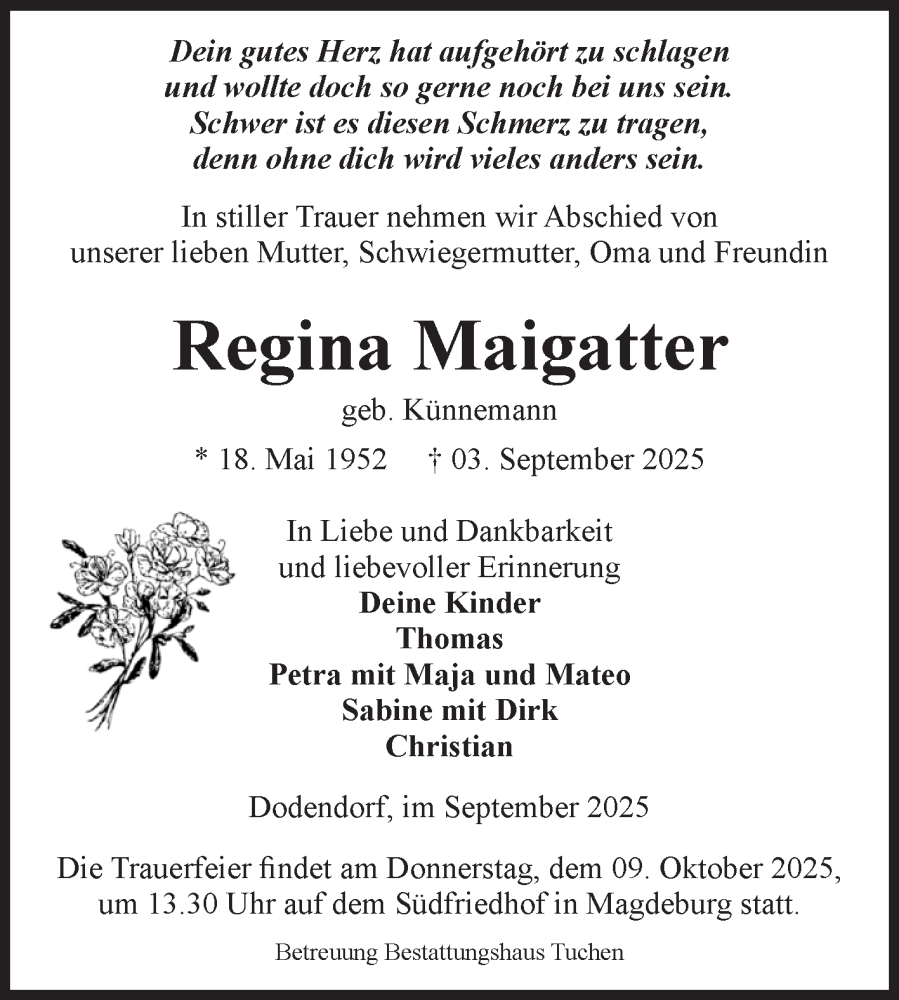 Hier finden Sie alle Traueranzeigen aus der Zeitung, die bisher für Regina Maigatter erschienen sind. Weitere Traueranzeigen, die in der Zeitung erscheinen, werden hier ebenfalls aufgelistet