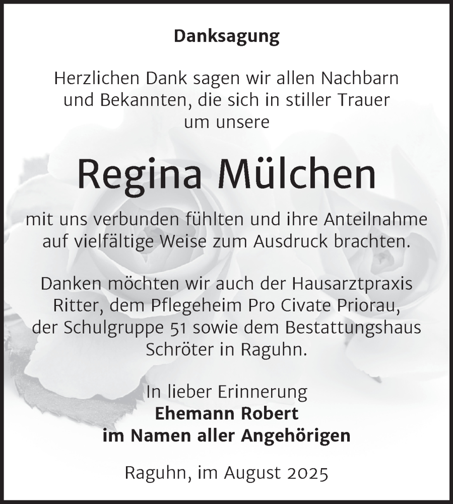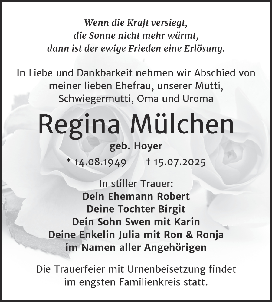 Hier finden Sie alle Traueranzeigen aus der Zeitung, die bisher für Regina Mülchen erschienen sind. Weitere Traueranzeigen, die in der Zeitung erscheinen, werden hier ebenfalls aufgelistet