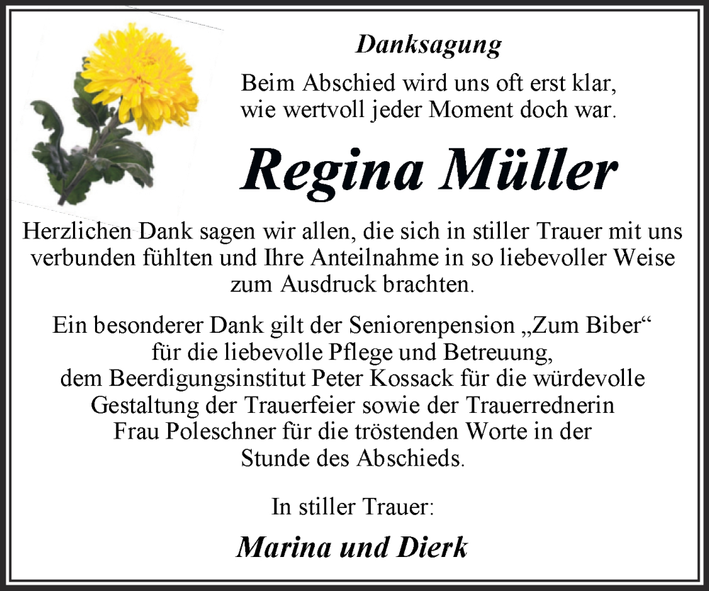 Hier finden Sie alle Traueranzeigen aus der Zeitung, die bisher für Regina Müller erschienen sind. Weitere Traueranzeigen, die in der Zeitung erscheinen, werden hier ebenfalls aufgelistet