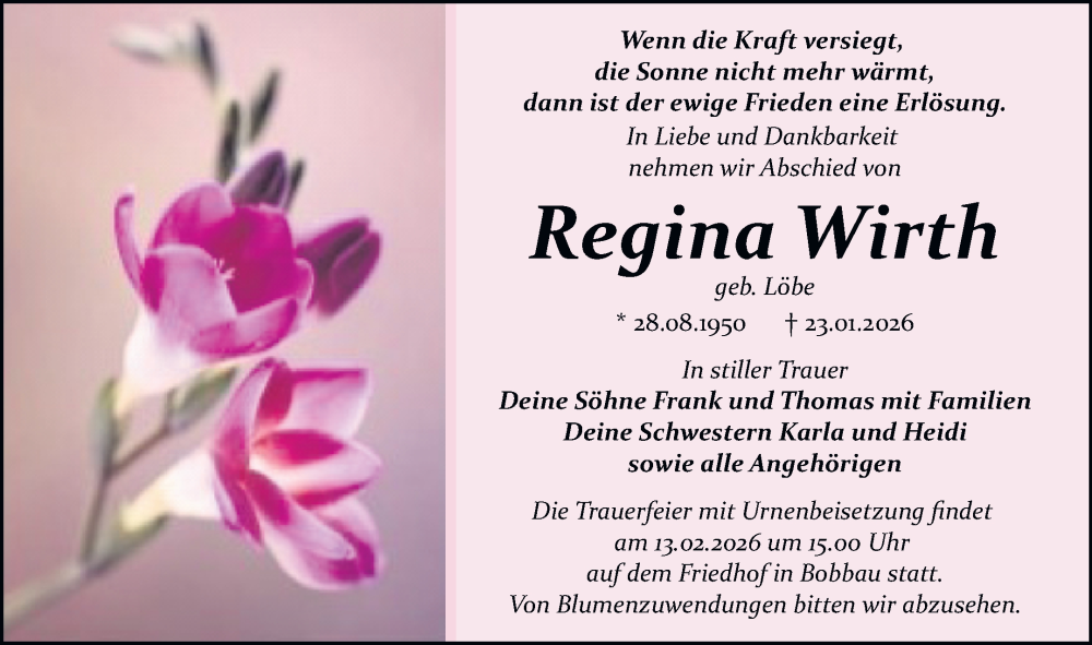 Hier finden Sie alle Traueranzeigen aus der Zeitung, die bisher für Regina Wirth erschienen sind. Weitere Traueranzeigen, die in der Zeitung erscheinen, werden hier ebenfalls aufgelistet