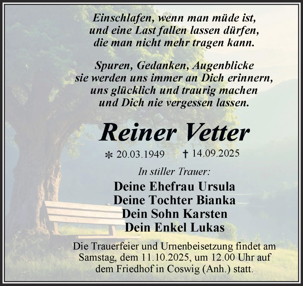 Hier finden Sie alle Traueranzeigen aus der Zeitung, die bisher für Reiner Vetter erschienen sind. Weitere Traueranzeigen, die in der Zeitung erscheinen, werden hier ebenfalls aufgelistet