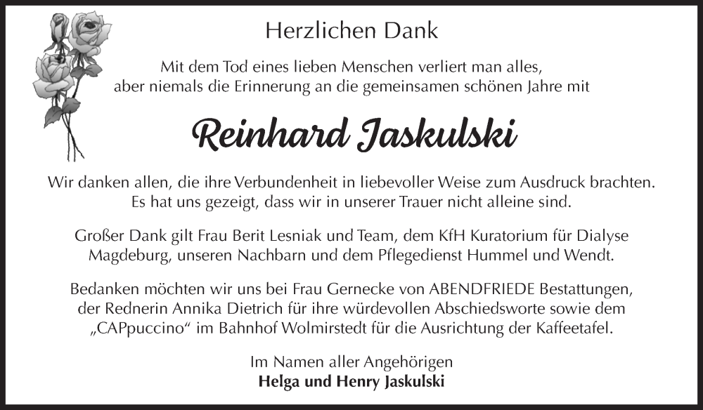 Hier finden Sie alle Traueranzeigen aus der Zeitung, die bisher für Reinhard Jaskulski erschienen sind. Weitere Traueranzeigen, die in der Zeitung erscheinen, werden hier ebenfalls aufgelistet