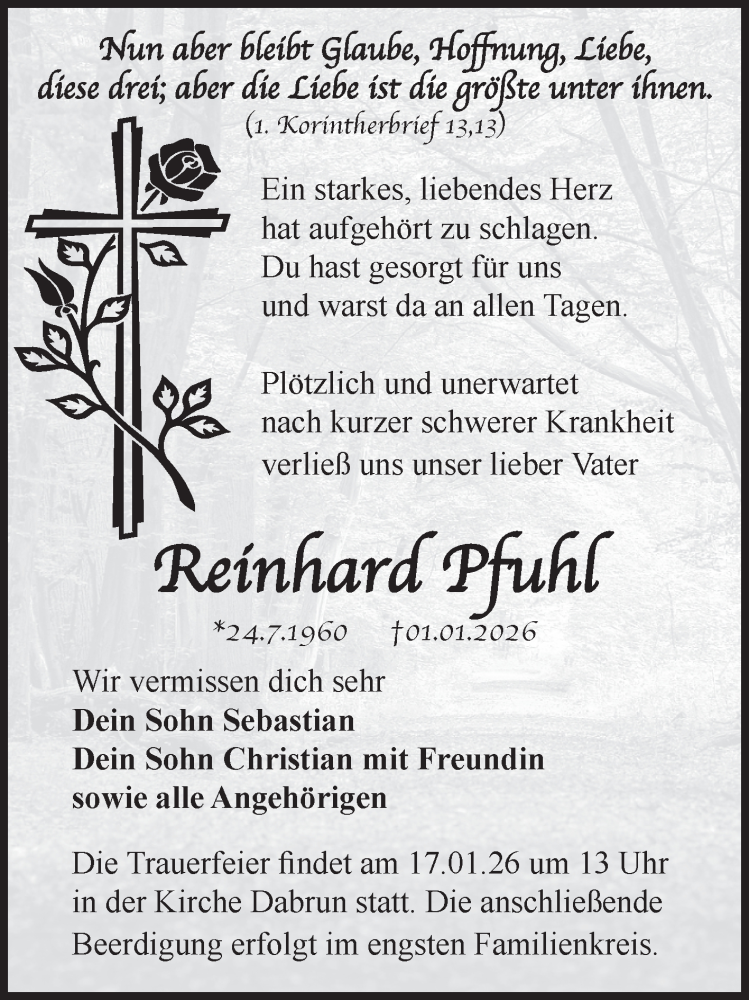 Hier finden Sie alle Traueranzeigen aus der Zeitung, die bisher für Reinhard Pfuhl erschienen sind. Weitere Traueranzeigen, die in der Zeitung erscheinen, werden hier ebenfalls aufgelistet