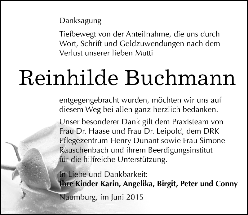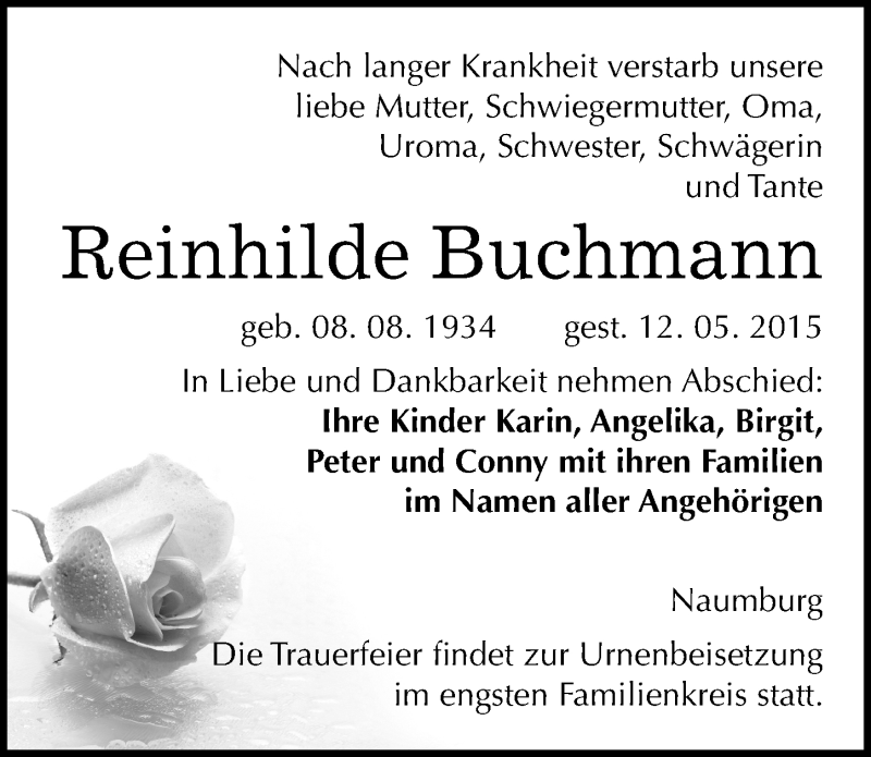 Hier finden Sie alle Traueranzeigen aus der Zeitung, die bisher für Reinhilde Buchmann erschienen sind. Weitere Traueranzeigen, die in der Zeitung erscheinen, werden hier ebenfalls aufgelistet