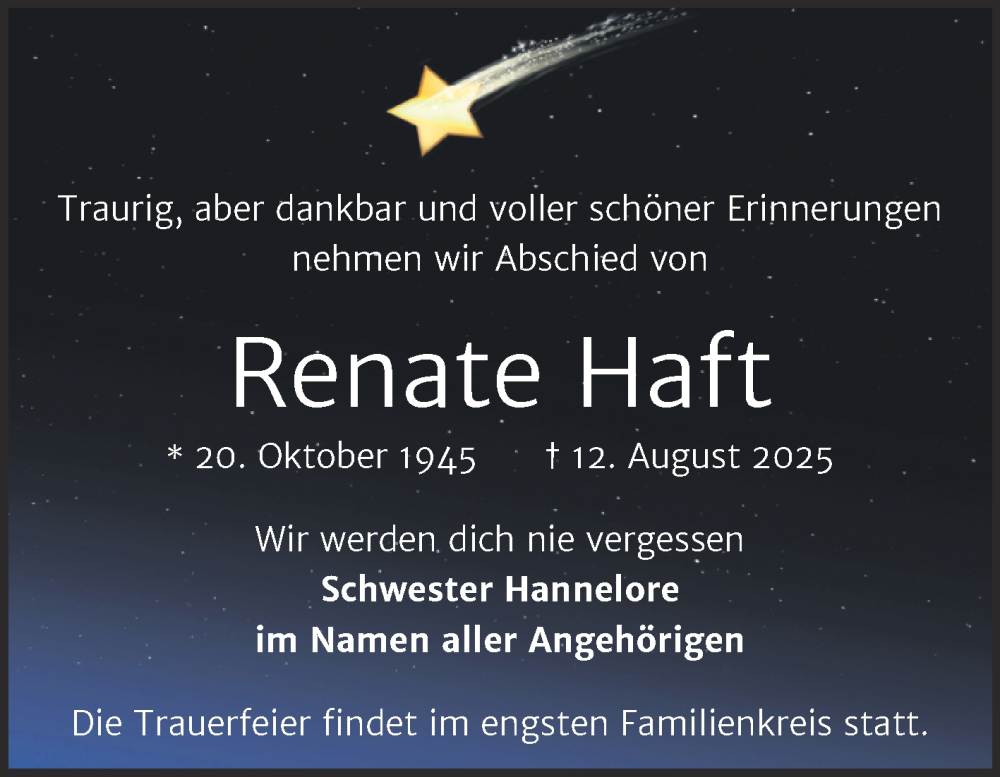 Hier finden Sie alle Traueranzeigen aus der Zeitung, die bisher für Renate Haft erschienen sind. Weitere Traueranzeigen, die in der Zeitung erscheinen, werden hier ebenfalls aufgelistet