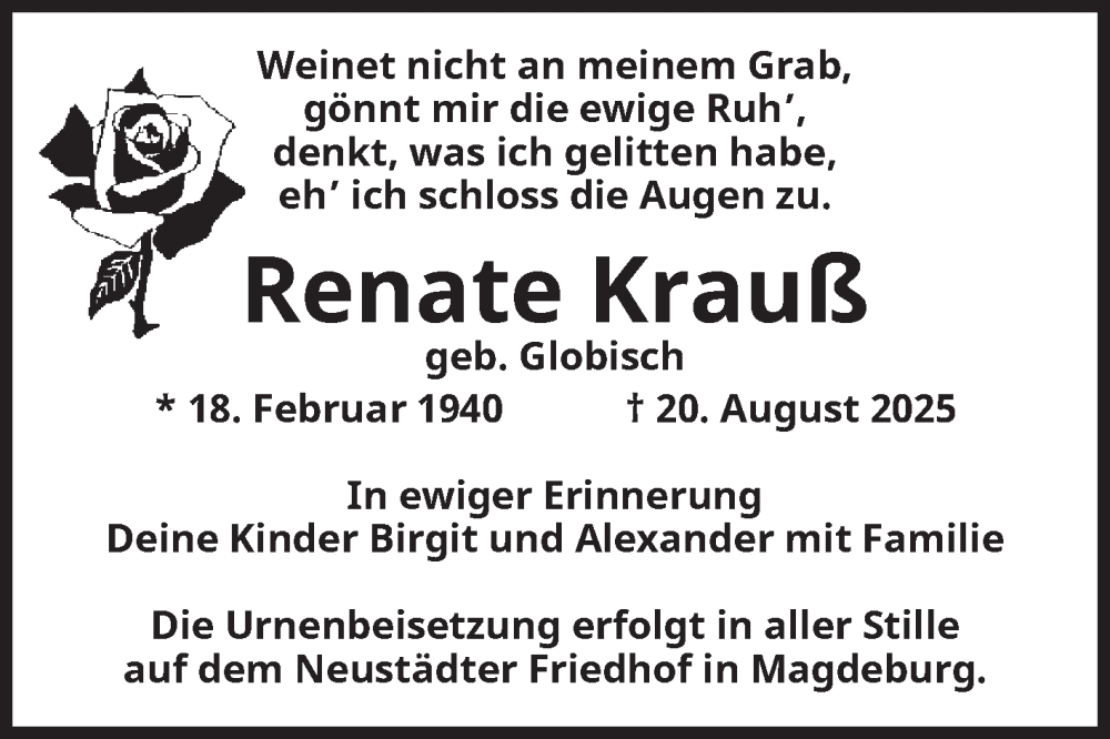 Hier finden Sie alle Traueranzeigen aus der Zeitung, die bisher für Renate Krauß erschienen sind. Weitere Traueranzeigen, die in der Zeitung erscheinen, werden hier ebenfalls aufgelistet