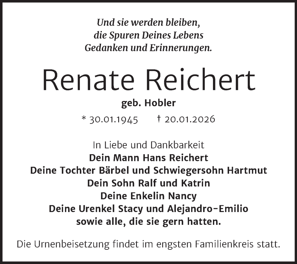 Hier finden Sie alle Traueranzeigen aus der Zeitung, die bisher für Renate Reichert erschienen sind. Weitere Traueranzeigen, die in der Zeitung erscheinen, werden hier ebenfalls aufgelistet
