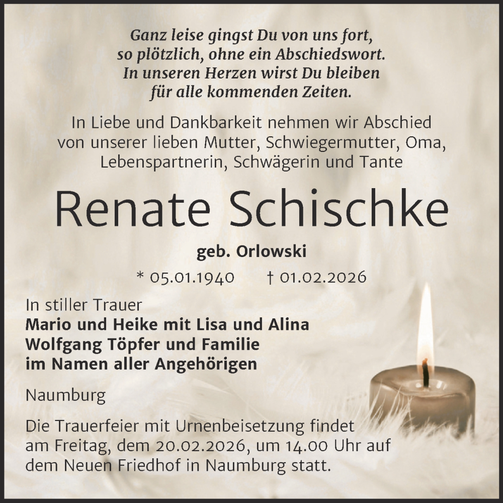 Hier finden Sie alle Traueranzeigen aus der Zeitung, die bisher für Renate Schischke erschienen sind. Weitere Traueranzeigen, die in der Zeitung erscheinen, werden hier ebenfalls aufgelistet
