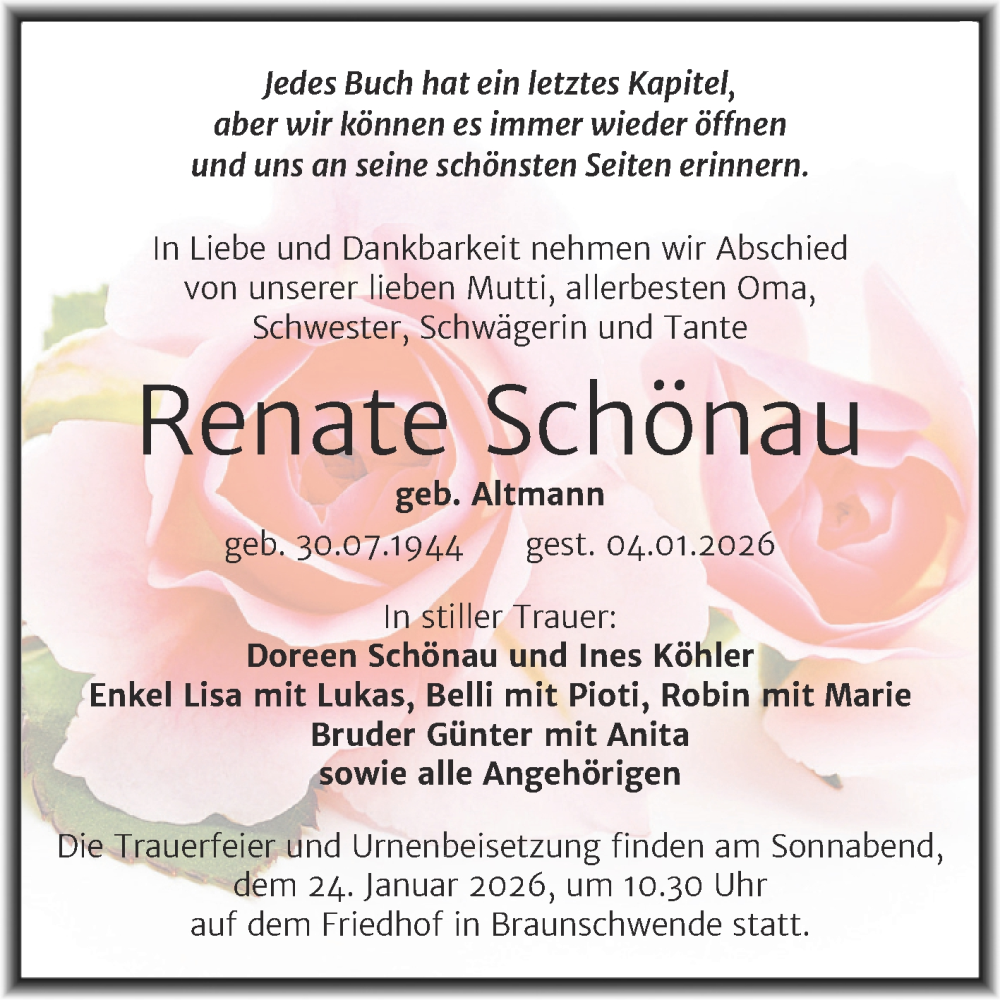 Hier finden Sie alle Traueranzeigen aus der Zeitung, die bisher für Renate Schönau erschienen sind. Weitere Traueranzeigen, die in der Zeitung erscheinen, werden hier ebenfalls aufgelistet