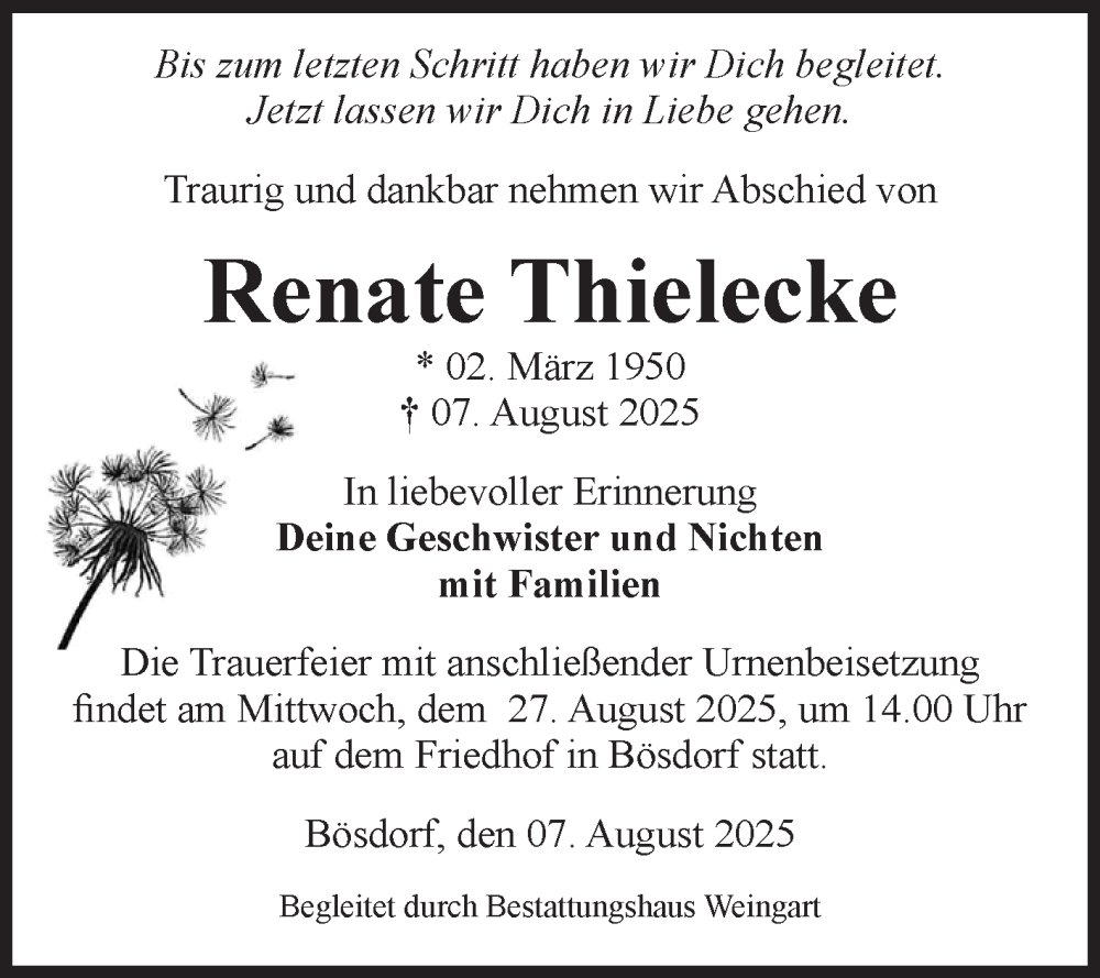 Hier finden Sie alle Traueranzeigen aus der Zeitung, die bisher für Renate Thielecke erschienen sind. Weitere Traueranzeigen, die in der Zeitung erscheinen, werden hier ebenfalls aufgelistet
