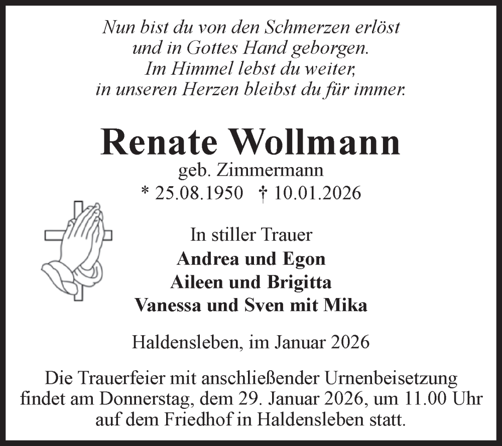 Hier finden Sie alle Traueranzeigen aus der Zeitung, die bisher für Renate Wollmann erschienen sind. Weitere Traueranzeigen, die in der Zeitung erscheinen, werden hier ebenfalls aufgelistet
