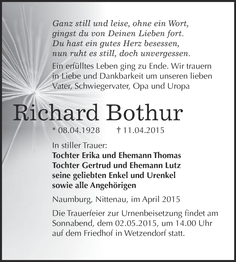 Hier finden Sie alle Traueranzeigen aus der Zeitung, die bisher für Richard Bothur erschienen sind. Weitere Traueranzeigen, die in der Zeitung erscheinen, werden hier ebenfalls aufgelistet